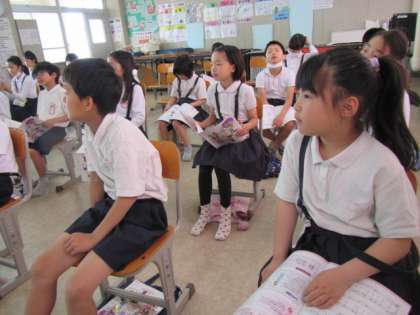 「風のメロディ」の学習が始まりました。みんなで楽譜を見ながら、お手本を聞いています。ピアノとリコーダーによる伴奏で歌います♪