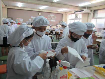 はじめての調理実習は「お茶」です。お茶っ葉からお茶を淹れて飲みます。「おいしい」「いいにおいがする」「苦い」…いろんな声が聞こえてきました♪