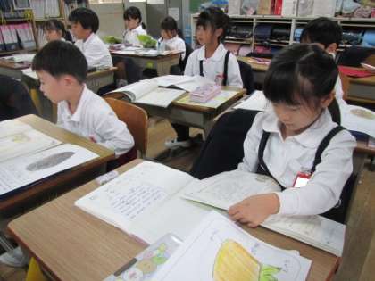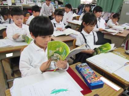 虫の体の様子を文章で伝えられるかな。教科書の、かまきりの文章を参考にみんなで取り組んでいます♪