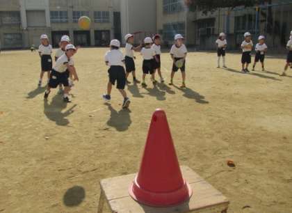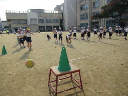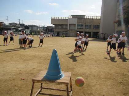 的をねらって力いっぱいボールを投げます。さわやかな秋空の下、元気いっぱい運動を楽しんでいます♪