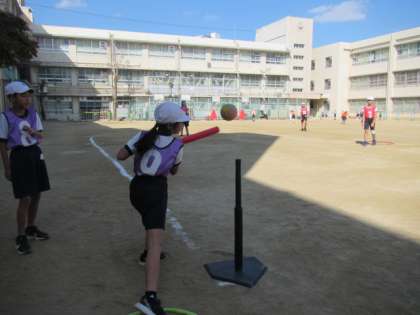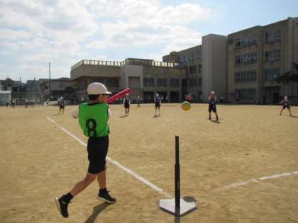 ティーバッテイングゲーム、楽しんでいます。かっとばせ!めざせホームラン!