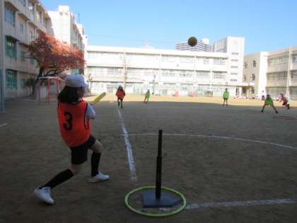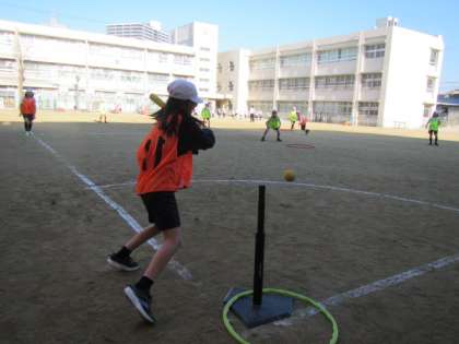 青空の下で気持ちよくプレーしています。ナイスバッティング!