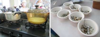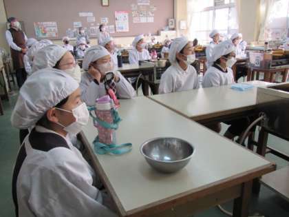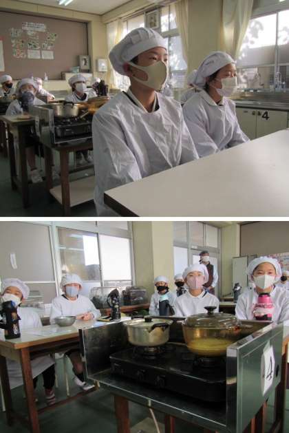 5年生の調理実習が始まりました。メニューは、白ごはんとお味噌汁です。まずは先生の説明を聞いています♪