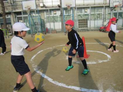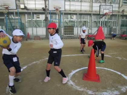 サークルまとあてゲームを楽しんでいます。攻めと守りのせめぎあいがおもしろいゲームです。攻めも守りもがんばれ♪