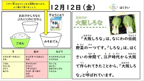 今日の給食では,「なにわ伝統野菜」の一つである「大阪しろな」をつかった煮びたしが登場しています。