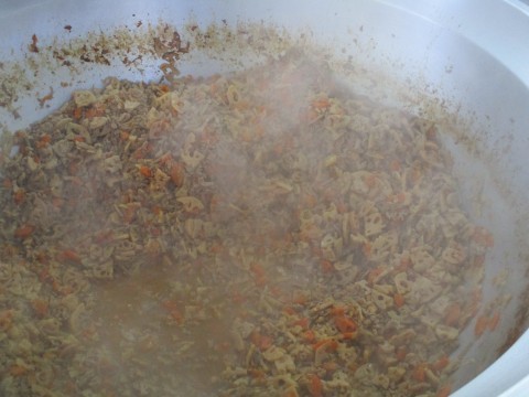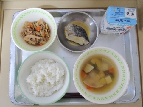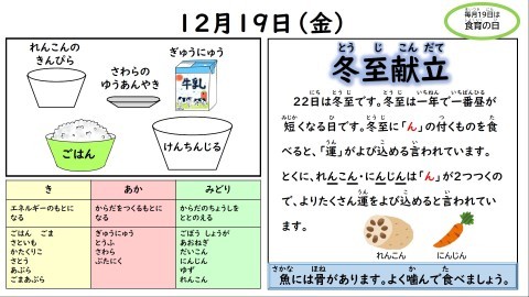 今日の給食では,「れんこん」「にんじん」「だいこん」など「ん」のつく食べ物をいろいろ使っています。