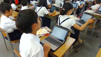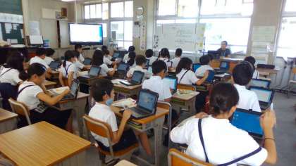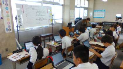 1組の音楽の様子です。今日はタブレットを使って学習する曲を詳しく調べていました。