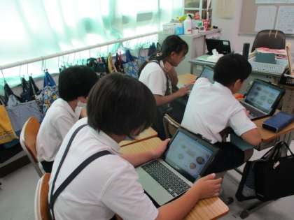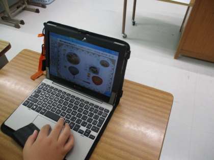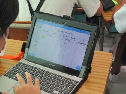 タブレットの発表ノートで作成した食育教材を使って、栄養バランスのよい献立を考えました。
