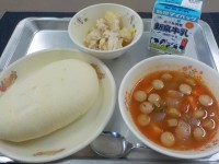 今日の献立は、ミネストローネ、ツナとポテトのマヨネーズふうみやき、オリーブパン、...