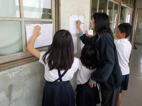 担任の先生がお休みの1組は、プリント学習にはげんでいます。1枚終わると廊下に張り出された解答で○つけをしています。