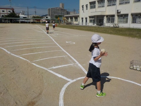 青空の下、2年生からソフトボール投げをスタートしました。まずは、フェアーゾーンに投げることが肝要です。しっかり投げることができていますよ。