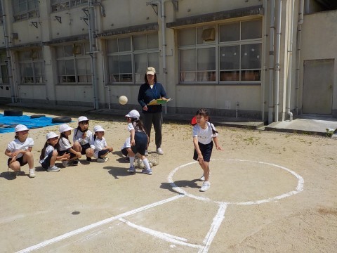 2時間目は1年生です。まっすぐ投げることやななめ上に投げることが難しい児童がいますね。地面にたたきつけてしまう児童もけっこういます。しかし、なんとか記録は計測できました。よくがんばりました!