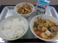 ビーフンスープ、肉団子のピリ辛煮、ごはん、牛乳です。ビーフンとはお米の粉から作られた麺です。