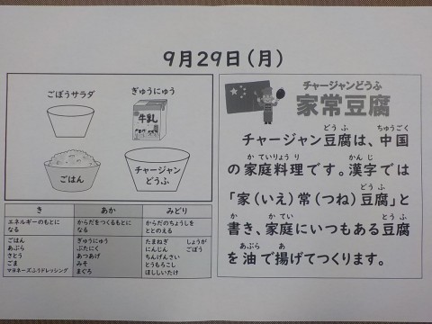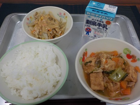 今日の献立は、チャージャンどうふ、ごぼうサラダ、ごはん、牛乳です。