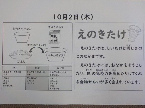 今日の献立は、ハヤシライス、えのきベーコン、ごはん、牛乳です。