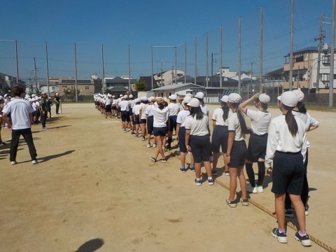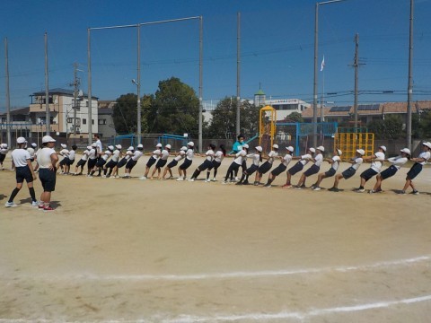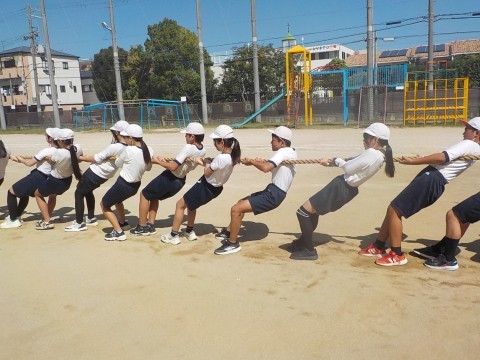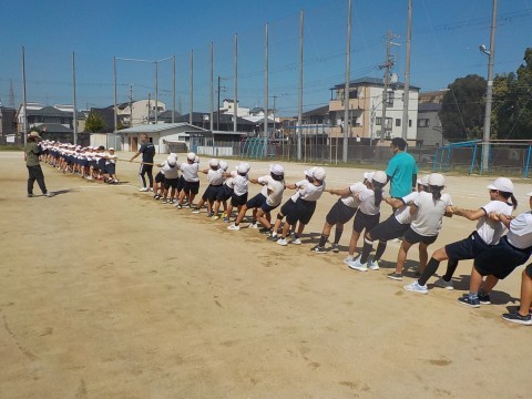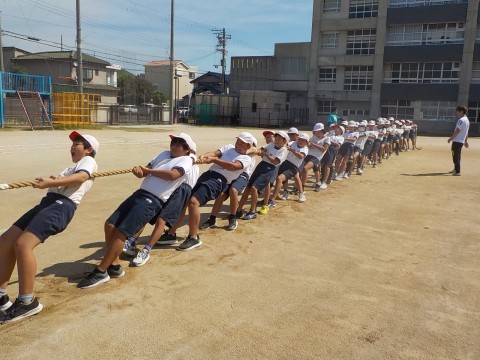 6年生が新湊小学校を訪れ,つな引きの練習試合を行いました。強い日差しの中,両校とも一生懸命つなを引きました。「せーの!せーのっ!」と掛け声をかけながら必死で競い合う姿に6年生の頼もしさを感じました。