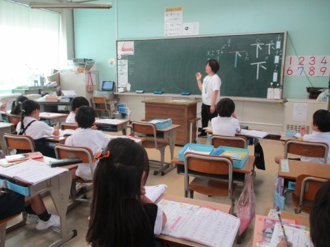 新出漢字「上」と「下」。読み方や使い方が子どもたちからもどんどん出てきます。