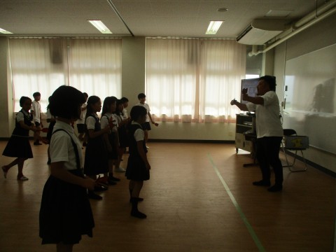 体育参観の団体演技にむけて,実行委員の人を中心に休み時間に練習を始めました。