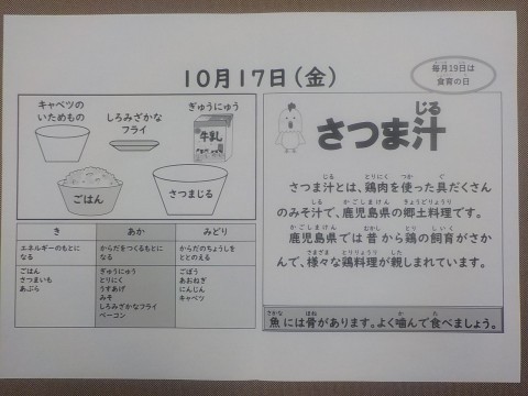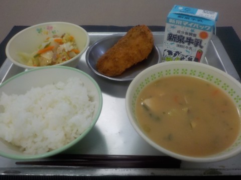 今日の献立は、さつまじる、キャベツのいためもの、しろみざかなフライ、ごはん、牛乳です。