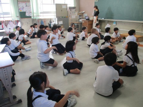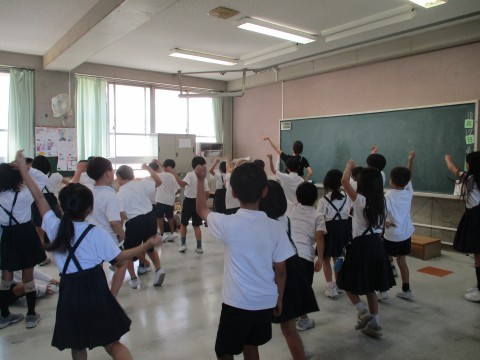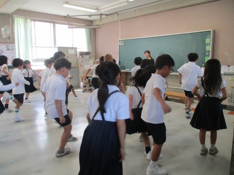 体育大会団体演技の振り付けを,まずは教室で先生の動きとテレビを見ながら覚えています。