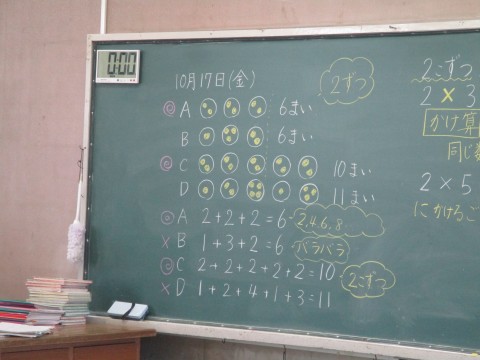 2年生後半「下」の教科書に入り,いよいよかけ算の学習に入ります。かけ算の考え方の基本を学んでいます。