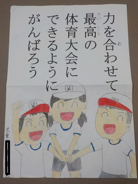 給食の時間に児童会から体育大会の目標が放送で告知されました。今年の体育大会の目標は,「力を合わせて最高の体育大会にできるようにがんばろう」です。