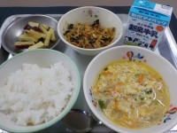 今日の献立は、カレーうどん、わふうサラダ、ごはん、牛乳です。