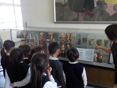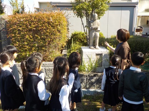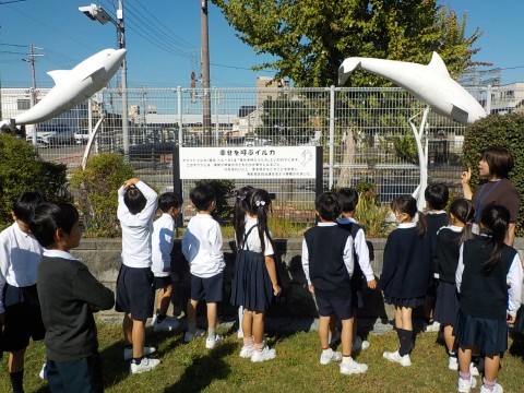 おうちの人に学校の紹介をするようです。その材料集めのため先生に学校の中のいろんな所を案内してもらいました。幸せを呼ぶイルカのオブジェや二宮金次郎の像など,普段あまり見ることのない場所を知りました。
