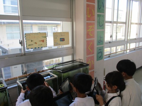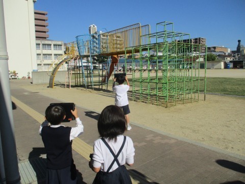 「しらせたいな,見せたいな」の単元です。学校の中で見つけたものを知らせる絵と文を書くため,タブレットをもって写真撮影に行きました。