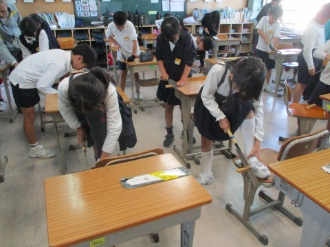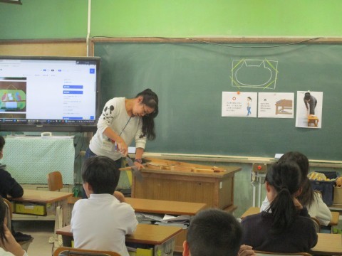 のこぎりを使って作品をつくります。はじめてののこぎりの学習には,校長先生も教えに来てくれました。