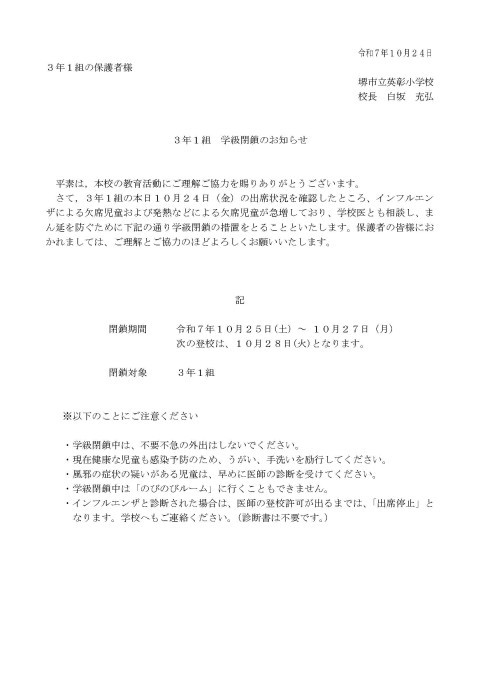 さて,3年1組の本日10月24日(金)の出席状況を確認したところ、インフルエンザによる欠席児童および発熱などによる欠席児童が急増しており、学校医とも相談し、まん延を防ぐために下記の通り学級閉鎖の措置をとることといたします。保護者の皆様におかれましては、ご理解とご協力のほどよろしくお願いいたします。