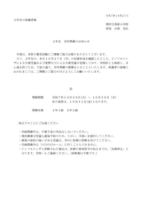 さて,2年生の本日10月27日(月)の出席状況を確認したところ、インフルエンザによる欠席児童および発熱などによる欠席児童が急増しており、学校医とも相談し、まん延を防ぐため下記の通り学年閉鎖の措置をとることといたします。保護者の皆様におかれましては、ご理解とご協力のほどよろしくお願いいたします。
