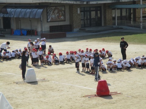 本日は団体競技の一斉練習日です。低学年は「おみこしわっしょい」。紅白のおみこしをどちらがはやく運べるかを競います。