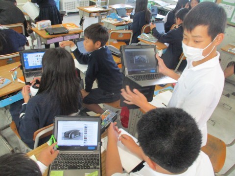 自動車会社がどのような自動車を開発しようとしているのか,タブレットを使って調べました。新しい形と性能にみんなでワクワクしました。