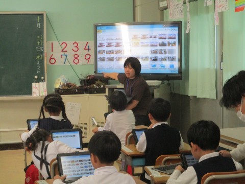 午後の生活科は,タブレットを使って「はっぴょうノート」を体験しました。写真をはりつけたり,文字を書いたりしています。