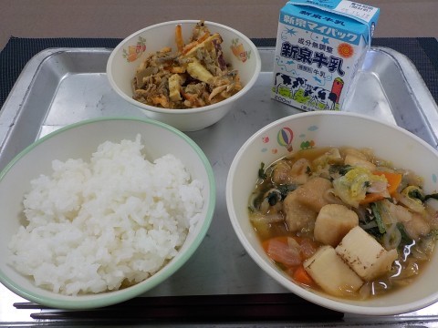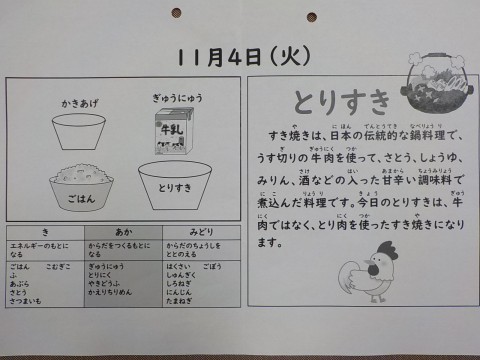 今日の献立は、とりすき、かきあげ、ごはん、牛乳です。