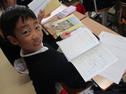 「将来,消防士になりたいんだ~」丁寧にまとめたノートを見せてくれました。消防署の学習を通して夢が広がったようです。