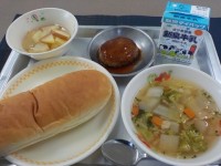 今日の献立は、ポークビーンズ、ツナとキャベツのソテー、コーンブレッド、ミニコッペパン、牛乳です。