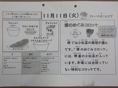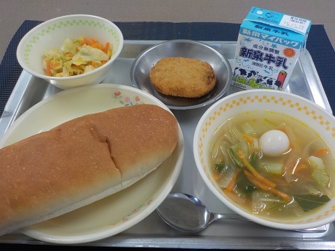 今日の献立は、ちんげんさいとうずらたまごのスープ、さんしょくソテー、さかいのめぐみコロッケ、コッペパン、牛乳です。
