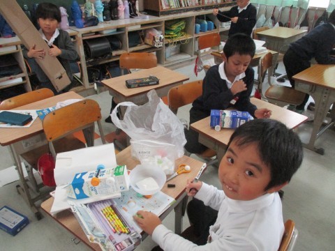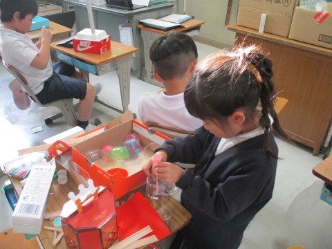 「おもちゃの作り方をせつめいしよう」という学習があります。今日は実際におもちゃを作っています。見通しをもって作ることができたかな。