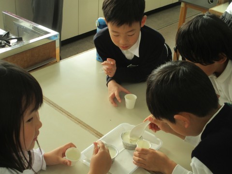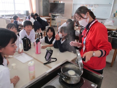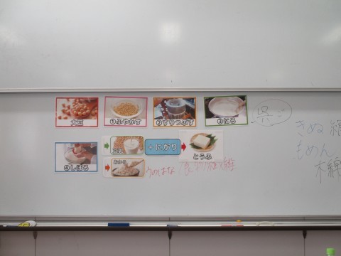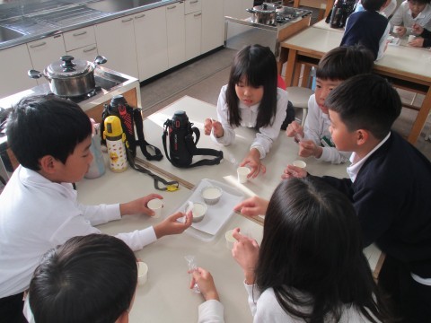 コープの出前授業で豆腐をつくりました。作りたてあつあつの豆腐をグループで食べているところです。