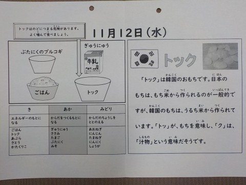 今日の献立は、トック、ぶたにくのプルコギ、ごはん、牛乳です。