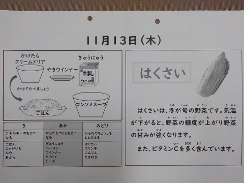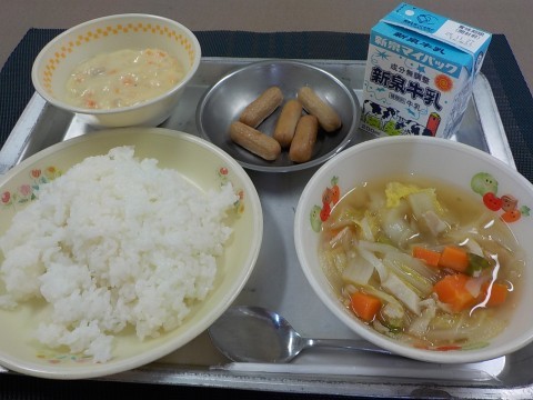 今日の献立は、コンソメスープ、かけたらクリームドリア、やきウインナー、ごはん、牛乳です。