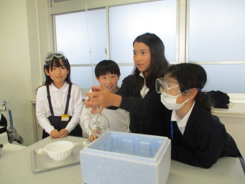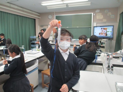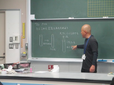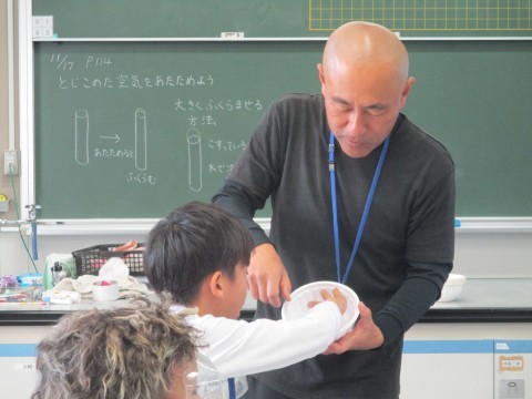 空気をあたためたり冷やしたりすると体積が変化することを調べる実験を行いました。ガラス管の中を動くゼリーに大興奮です。