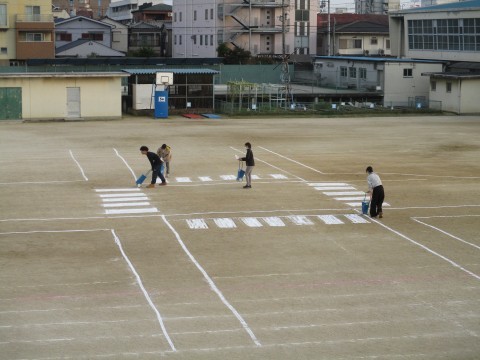 明日の交通安全教室に備えて,先生たちで運動場に道をつくりました。