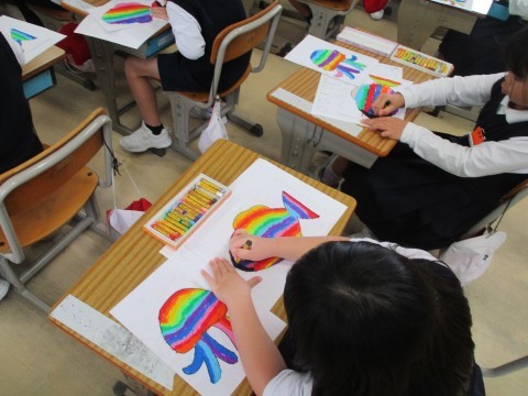 カラフルに色を塗った魚やクラゲの上から,黒のクレパスで重ね塗りをしています。このあとつまようじでひっかくことによって,夜の魚やクラゲの完成です。けずるという技の名人になれるかな。