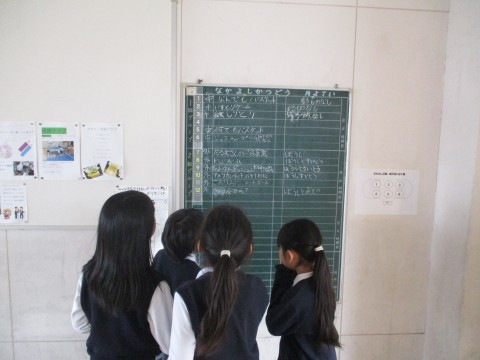 5時間目は全校一斉になかよし班活動です。校舎の2階渡り廊下に6年生が班の計画を書いてくれていますが,午前中に1年生が自分の班の予定を確認して,大喜びしているところに遭遇しました。