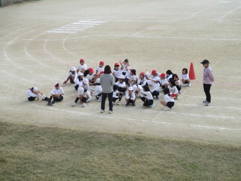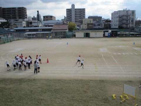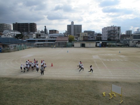 小型ハードルを使って,ハードル走の感覚をつかんでいます。