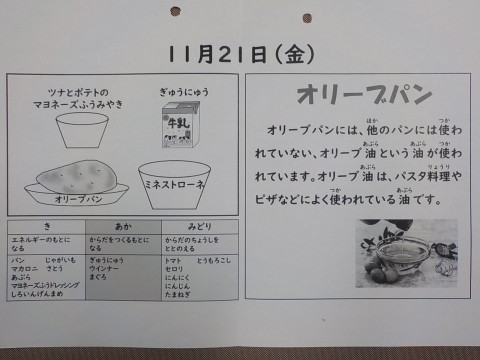 今日の献立は、ミネストローネ、ツナとポテトのマヨネーズふうみやき、オリーブパン、牛乳です。
