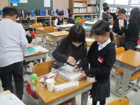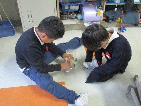 ジャンプロケットやビュンビュンカー,パタパタぐるまなど,友達と協力しておもちゃづくりをしています。